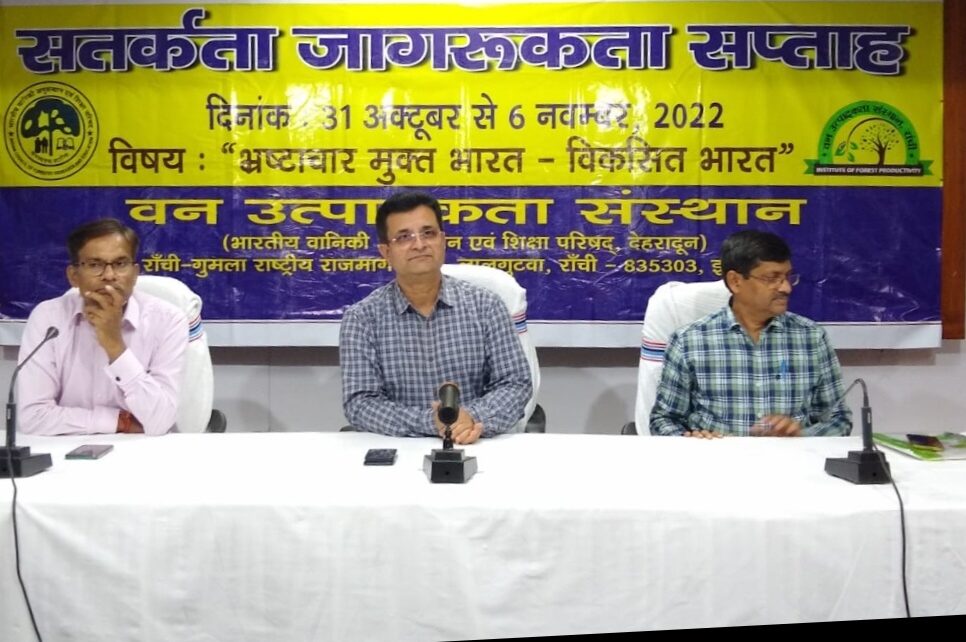 वन उत्पादकता संस्थान, रांची में 31 अक्टूबर 2022 से 6 नवम्बर 2022, विषय “भ्रस्टाचार मुक्त भारत – विकसित भारत” के अन्तर्गत सतर्कता जागरूकता सप्ताह का आयोजन किया गया। इस सप्ताह की शुरूआत 31 अक्टूबर को संस्थान के निदेशक डॉ. नितिन कुलकर्णी एवं संस्थान के सतर्कता अधिकारी डॉ. अनिमेष सिन्हा के द्वारा संस्थान के सभी अधिकारियों, कर्मचारियों एव विद्यार्थियों को अपने कार्यकलापों में ईमानदारी एवं पारदर्शिता बनाए रखने की शपथ दिलाकर की गई।