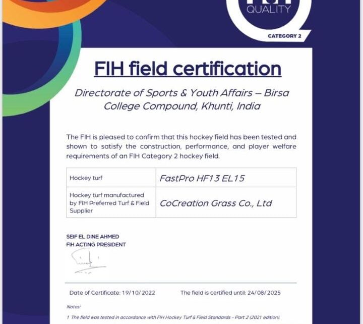 खूंटी के बिरसा कॉलेज में निर्मित हॉकी टर्फ मैदान को एफआईएच फील्ड सर्टिफिकेट प्राप्त हो गया है। यह सर्टिफिकेट मैदान की सभी गुणवत्ता को परखने के बाद प्रदान किया जाता है। ताकि खिलाड़ियों की सुरक्षा, संसाधन सुनिश्चित हो सके। साथ ही, अंतरराष्ट्रीय स्तर के मैच का आयोजन के मापदंडों में खरा उतर सके। इन बातों की पुष्टि होने के उपरांत ही एफआईएच फील्ड सर्टिफिकेट प्रदान करने की अनुमति दी जाती है। सर्टिफिकेट प्राप्ति के बाद अब जिला के प्रतिभाशाली खिलाड़ी अंतर राष्ट्रीय स्तर के मैदान में अभ्यास कर अपनी प्रतिभा को और निखार सकेंगे।
