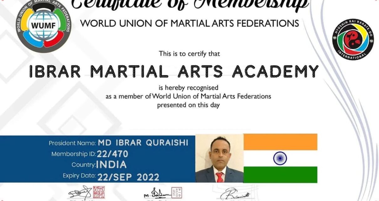 रांची, झारखण्ड | अप्रैल | 13, 2022 :: रांची के मोहम्मद इबरार कुरैशी के इबरार मार्शल आर्ट्स अकेडमी को वर्ल्ड यूनियन ऑफ़ मार्शल आर्ट्स फेडरेशन से मेम्बरशिप सर्टिफिकेट मिला है