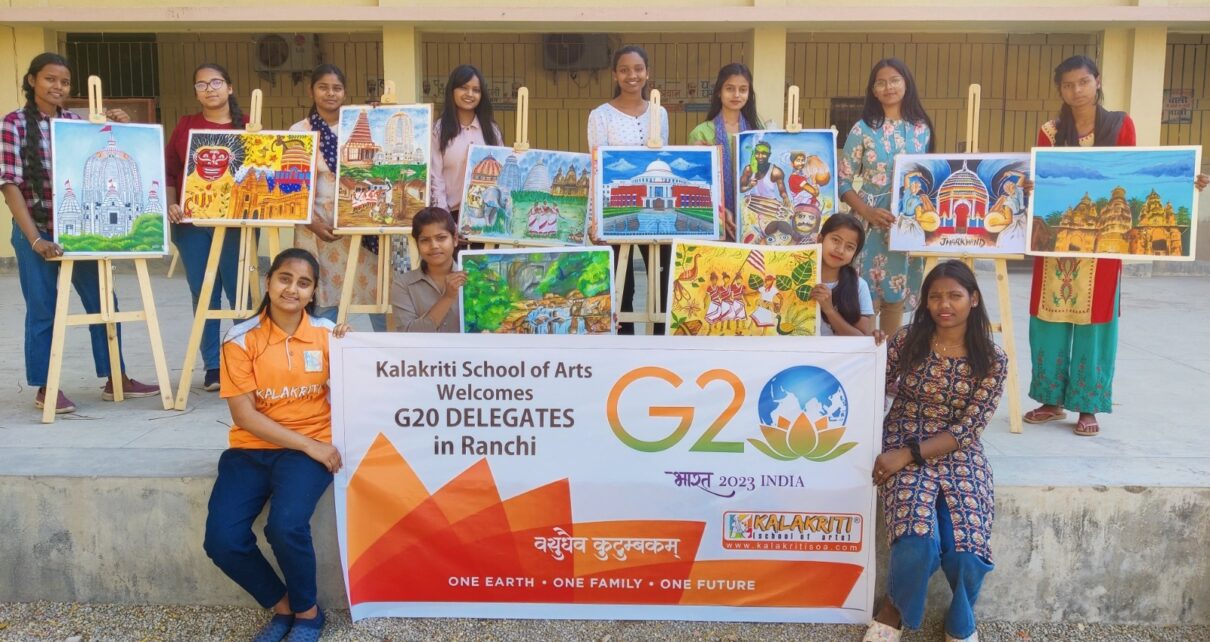 राची, झारखण्ड | फरवरी | 27, 2023 :: कलाकृति स्कूल ऑफ आर्ट एवं कलाकृति आर्ट फाउंडेशन के द्वारा रांची में जी-20 के शिखर सम्मेलन में आने वाले अतिथियों के स्वागत हेतु एक चित्रकला कार्यशाला *”वसुधैव कुटुम्बकम”* आयोजन किया गया | जिसके माध्यम से झारखंड के पर्यटन स्थल एवं धरोहर को कैनवस पर उकेर कर झारखंड की समृद्ध प्रकृति, संस्कृति एवं परंपराओं को प्रदर्शित किया | कलाकारों ने झारखंड के प्रमुख स्थलों जैसे स्मारक, मंदिरों ,झरनों , पारंपरिक नृत्य, वाद्ययंत्रों आदि को चित्रित किया |
