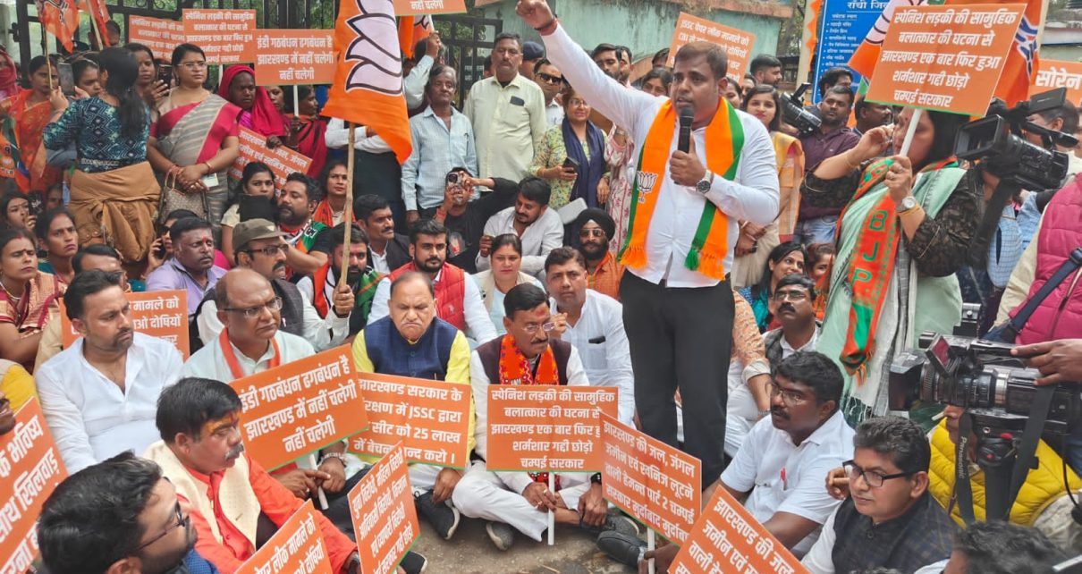 झारखंड में बढ़ते भ्रष्टाचार, बेरोजगारी, बालू, खनिज लूट, जमीन घोटाला, जे.एस.एस.सी (JSSC) पेपर लीक एवं दुमका में स्पेनिश महिला के साथ सामुहिक बलात्कार जैसी राज्य को शर्मशार करने वाली घटना के विरोध में भाजपा,रांची महानगर–जिला के द्वारा जिला अध्यक्ष वरूण साहू के नेतृत्व में जिला स्कूल मैदान से उपायुक्त कार्यालय तक आक्रोश प्रदर्शन किया गया।