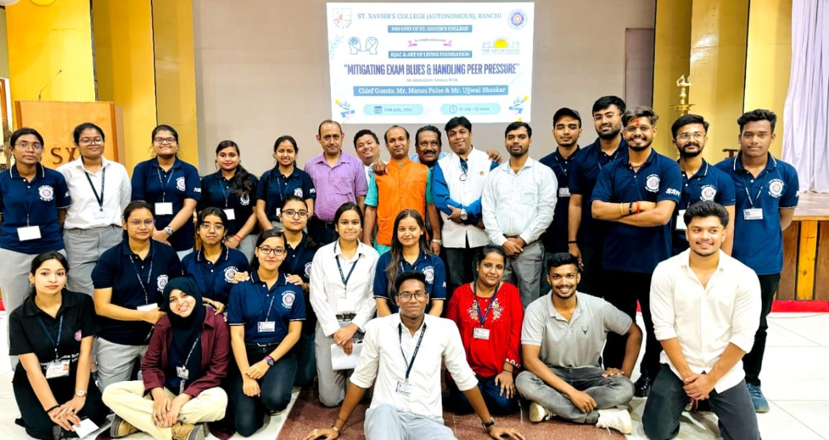 संत जेवियर्स कॉलेज रांची की एनएसएस इकाई ने आईक्यूएसी और आर्ट ऑफ लिविंग के सहयोग से फादर सी. डिब्रावर सभागार में परीक्षा संबंधी तनाव विषय पर वार्ता कार्यक्रम आयोजित की गई। कार्यक्रम का उद्घाटन काॅलेज के बर्सर फादर रवि हेमंत कुजूर एसजे और एनएसएस कार्यक्रम अधिकारी डॉ. अनिर्बान गुप्ता ने किया। कार्यक्रम में झारखंड प्रांत के हेड उज्जवल भास्कर ने विद्यार्थियों को परीक्षा के दौरान तनाव से उबरने के लिए कुछ टिप्स देते हुए बताया कि तनाव में शांत चित रहकर उसे घटाया जा सकता है और विषय को समझने में रूचि बढ़ जाती है| कार्यक्रम में छात्रों को कुछ प्राणयाम भी सिखाए गए जिससे तनाव को दूर किया जा सकता है| कार्यक्रम में बोलते हुए कॉलेज के प्राचार्य डॉ. फादर नाबोर लकड़ा एस.जे. ने परीक्षा संबंधी तनाव के समाधान की आवश्यकता का उल्लेख किया। इस कार्यक्रम में एनएसएस छात्र प्रतिनिधि जैसे सिदरा, रिमशाह, सिमियन, उर्वी और एनएसएस के सभी स्वयंसेवक उपस्थित थे|