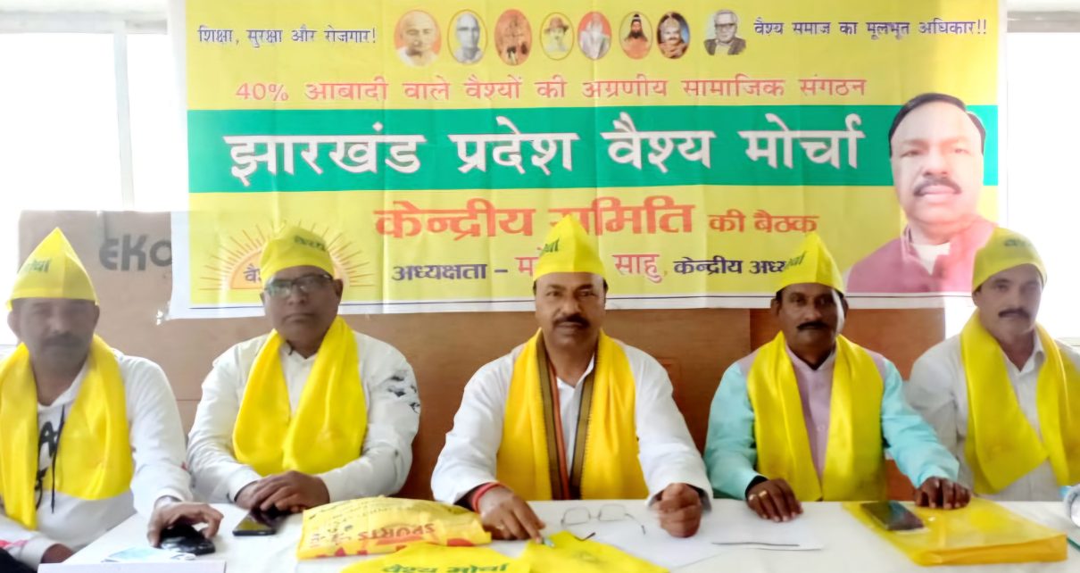 आज झारखंड प्रदेश वैश्य मोर्चा के प्रमुख सदस्यों एवं नीति निर्धारकों की एक महत्वपूर्ण बैठक रांची के रेडियम रोड़ स्थित आलोका सभागार में की गयी. इस बैठक की अध्यक्षता केंद्रीय अध्यक्ष महेश्वर साहु ने किया. बैठक में संपन्न स्थापना दिवस कार्यक्रम की समीक्षा, सत्र 2024-25 के लिए केंद्रीय समिति का गठन एवं विधानसभा चुनाव को लेकर विस्तार से चर्चा की गई. बैठक में सर्वसम्मति से कहा गया कि विपरित परिस्थितियों में भी वैश्य मोर्चा का 6वां स्थापना दिवस कार्यक्रम काफी सफल रहा. यह सभी कार्यकर्ताओं की मेहनत से सम्भव हो सका. वैश्य मोर्चा का गठन जिस उद्देश्य और मुद्दों को लेकर किया गया है, इसके लिए आगे भी आंदोलन और अभियान जारी रहेगा.