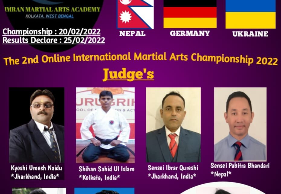 रांची, झारखण्ड | फरवरी | 24, 2022 :: इमरान मार्शल आर्ट्स अकेडमी के ओर से दी 2nd इंटरनेशनल ऑनलाइन मार्शल आर्ट्स काता चैंपियनशिप का आयोजन 20 फ़रवरी 2022 को किया गया था. जिसका रिजल्ट 25 फ़रवरी को डिक्लेअर होगा,