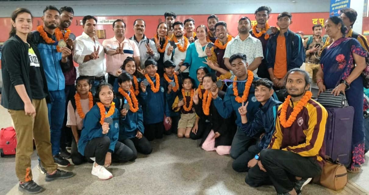 नेशनल एरोबिक्स जिमनास्टिक चैंपियनशिप में पदक जीत कर लौटे जिम्नास्टिक्स खिलाड़ियों का जोरदार स्वागत
