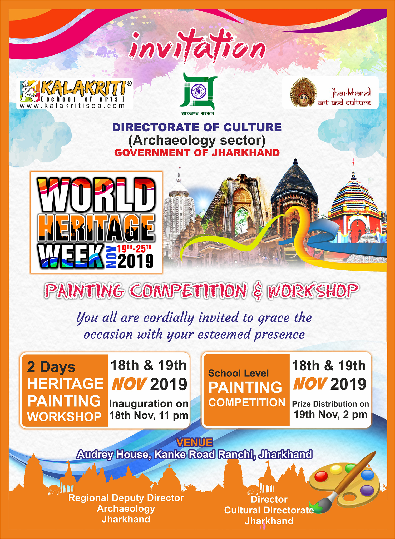 इस कार्यक्रम के अंतर्गत दो दिवसीय धरोहर चित्रकला कार्यशाला में कलाकृति स्कूल ऑफ़ आर्ट्स के निदेशक एवं चित्रकार धनंजय कुमार के मार्गदर्शन में संस्था के छात्रों के द्वारा झारखण्ड के धरोहरों की पेंटिंग्स की जाएगी | जिसका शुभारम्भ 18 नवम्बर को सुबह 11 बजे सांकृतिक निदेशालय के निदेशक श्री दीपक कुमार साही के करकमलों के द्वारा किया जायेगा | दिनांक 19 नवम्बर 2019 को स्कूली छात्रों के लिए चित्रकला प्रतियोगिता का आयोजन किया गया है जिसमे विद्यालय स्तर पर चयनित बच्चे अपनी प्रतिभा का प्रदर्शन करेंगे | उसी दिन दोपहर 2 बजे पुरस्कार वितरण का कार्यक्रम आयोजित किया जायेगा |