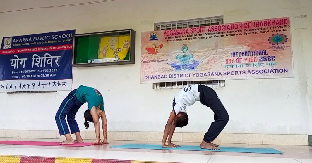 धनबाद, झारखण्ड | जून | 21, 2022 :: आठवां योग दिवस के शुभ अवसर पर अपर्णा पब्लिक स्कूल में धनबाद जिला योगासन स्पोर्ट्स एसोसिएशन के सहयोग से छह दिवसीय प्रोटोकॉल प्रैक्टिस सेशन एवं सिलेबस प्रैक्टिस का कार्यक्रम आयोजित हुआ जिसमें लगभग 100 बच्चों ने भाग लिया इस पूरे कार्यक्रम के संचालन में विद्यालय के योग शिक्षिका एवं धनबाद योगासना स्पोर्ट्स की प्रशिक्षक ने अपनी महत्वपूर्ण भूमिका निभाई बच्चों को योग प्रोटोकॉल एवं योगासना की विस्तृत जानकारी प्रैक्टिकल रूप से दिया गया जिससे आने वाले समय में बच्चे जिला स्तर से लेकर राष्ट्र स्तर पर अपने स्कूल और धनबाद का नाम रोशन कर सकते हैं इस पूरे कार्यक्रम के सफल संचालन के लिए विद्यालय के प्राचार्य अनुपम नायक सर ने जिला योगासन संघ को विशेष बधाई दी एवं आने वाले दिनों में और भी ऐसे कार्यक्रम आयोजित करने की बात कही इस अवसर पर विद्यालय के तमाम पदाधिकारी जिसमें प्रमुख रुप से केके सिंह सर मोदगिल सर केके सिंहा सर मोहिनी मैम सभी ने बच्चों को योग दिवस की हार्दिक बधाई एवं बेहतर भविष्य की कामना की जिला योगासन संघ के सेक्रेटरी विपिन कुमार पांडे ने भी बच्चों को बधाई संदेश दिया l